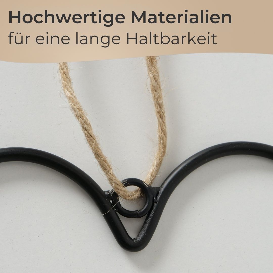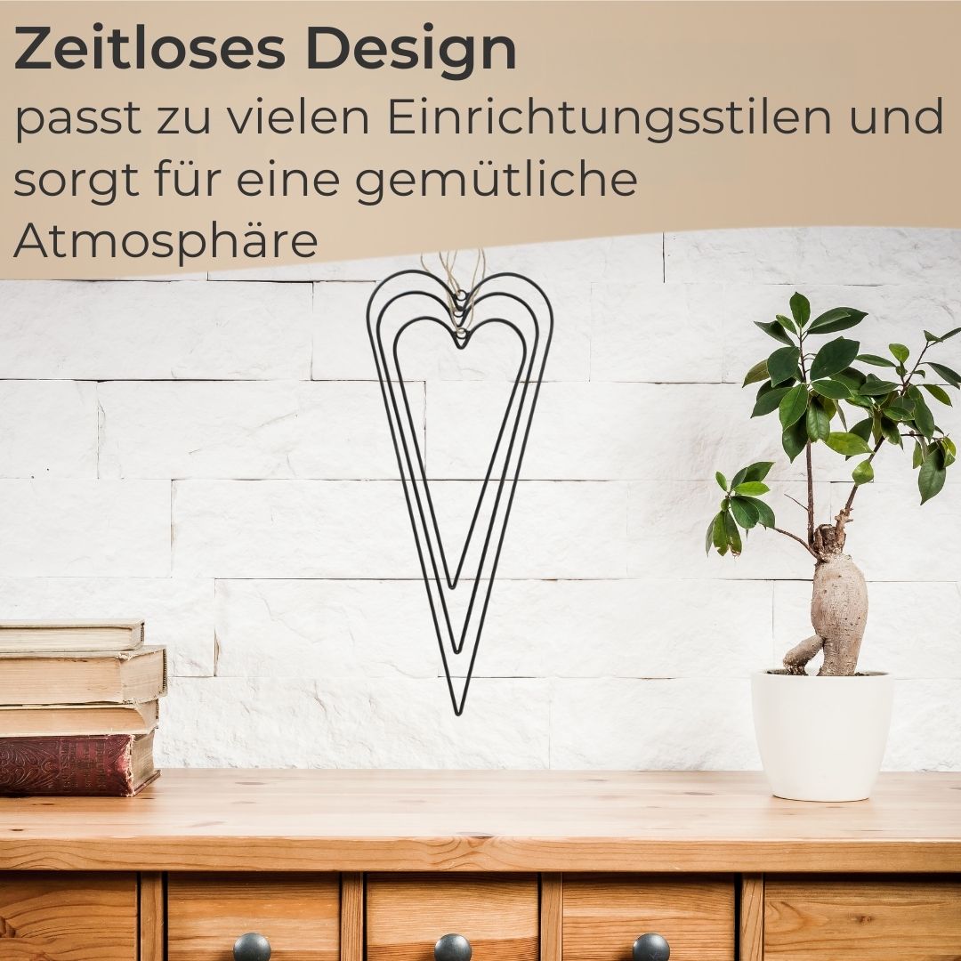 For a loving and stylish decoration in your home, the TOP PROVIDER 999 decorative heart set is the ideal choice. The decorative heart set includes three handcrafted hearts in various sizes, made of sturdy iron and finished with black lacquer. The use of jute ribbons gives the hanging decorations a rustic yet modern look that blends perfectly with various home styles.
