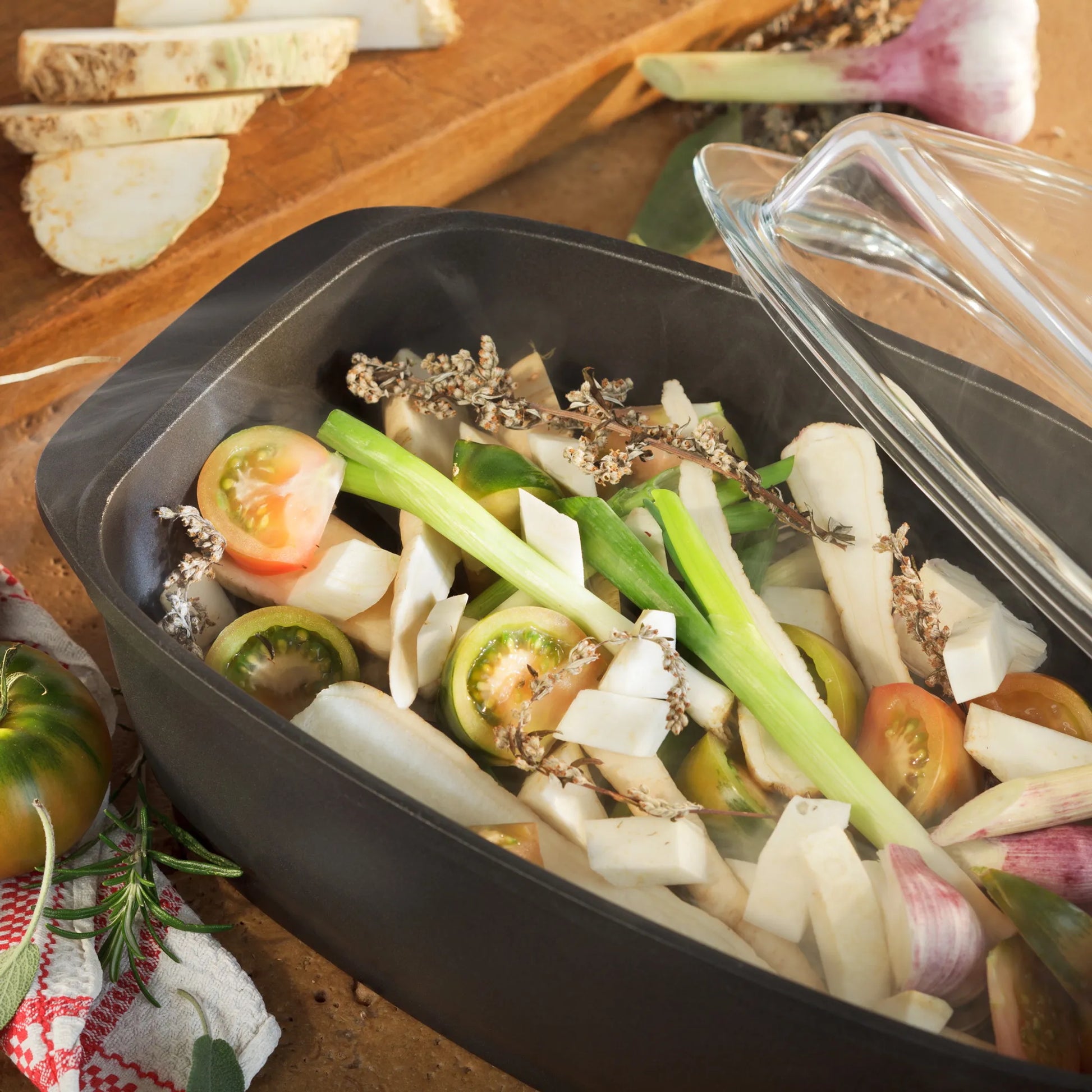 Der praktische Glasdeckel ermöglicht dir eine optimale Kontrolle über den Garprozess, ohne dass wertvolle Wärme entweichen muss – ideal für saftige Schmorgerichte und knusprige Aufläufe.