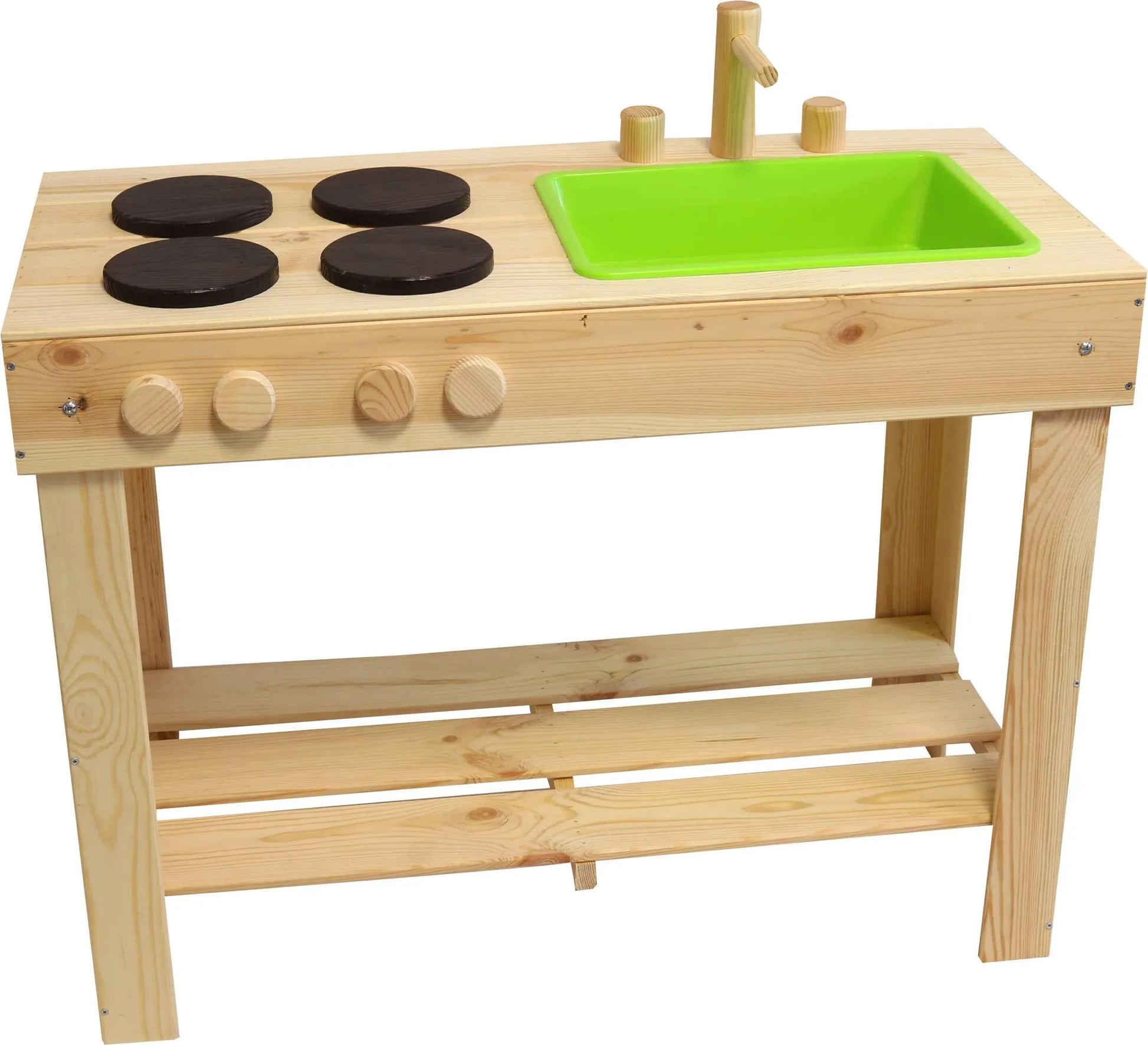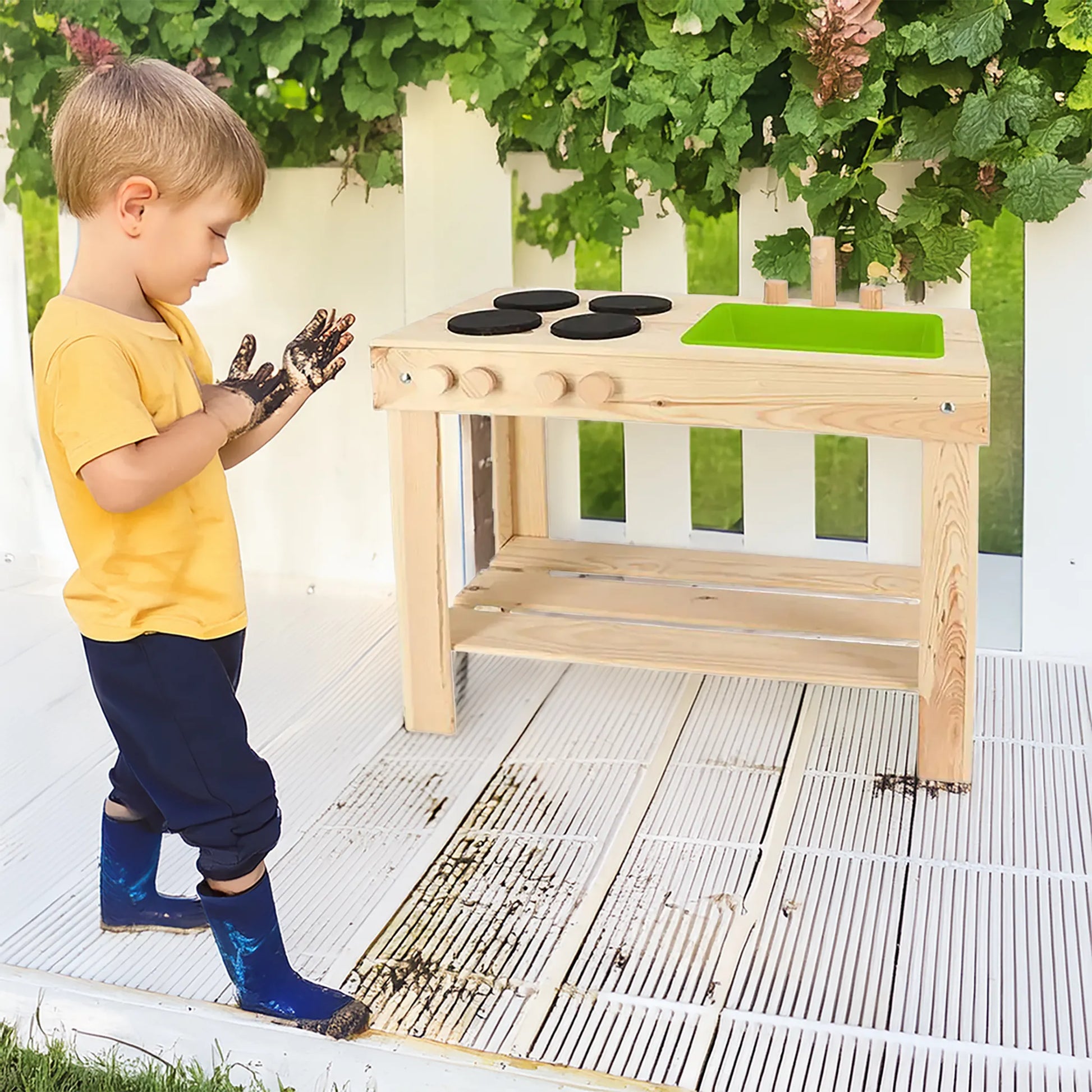 Gefertigt aus robustem Holz ist die Matschküche langlebig und wetterbeständig. Die durchdachte Ausstattung mit Arbeitsflächen, Ablagen und Spülbecken schafft eine authentische Spielumgebung, die Kinder zum Ausprobieren einlädt und gleichzeitig Ordnung ermöglicht.