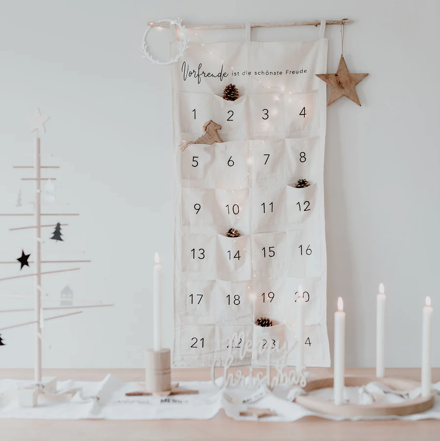 Durch die Größe von 120 x 60 cm und das minimalistische Design passt der Adventskalender Vorfreude Creme aus Stoff in jeden Raum.