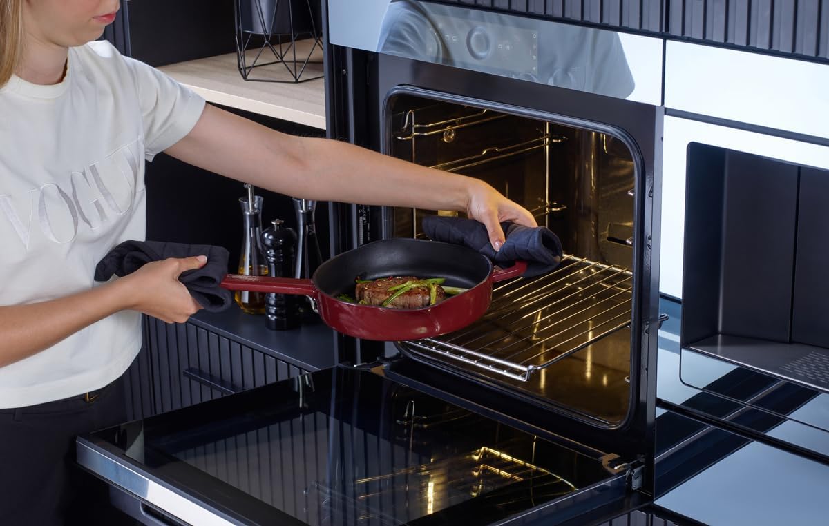 Die Pfanne besteht aus massivem Gusseisen mit einer robusten, emaillierten Oberfläche, die für eine gleichmäßige Wärmeverteilung und -speicherung sorgt. So gelingen Speisen mit intensiven Röstaromen und perfekter Konsistenz – auch bei geringer Hitzezufuhr. Die Emaillebeschichtung schützt das Gusseisen vor Rost und erleichtert die Reinigung, während der ergonomische Griff sicheren Halt bietet.