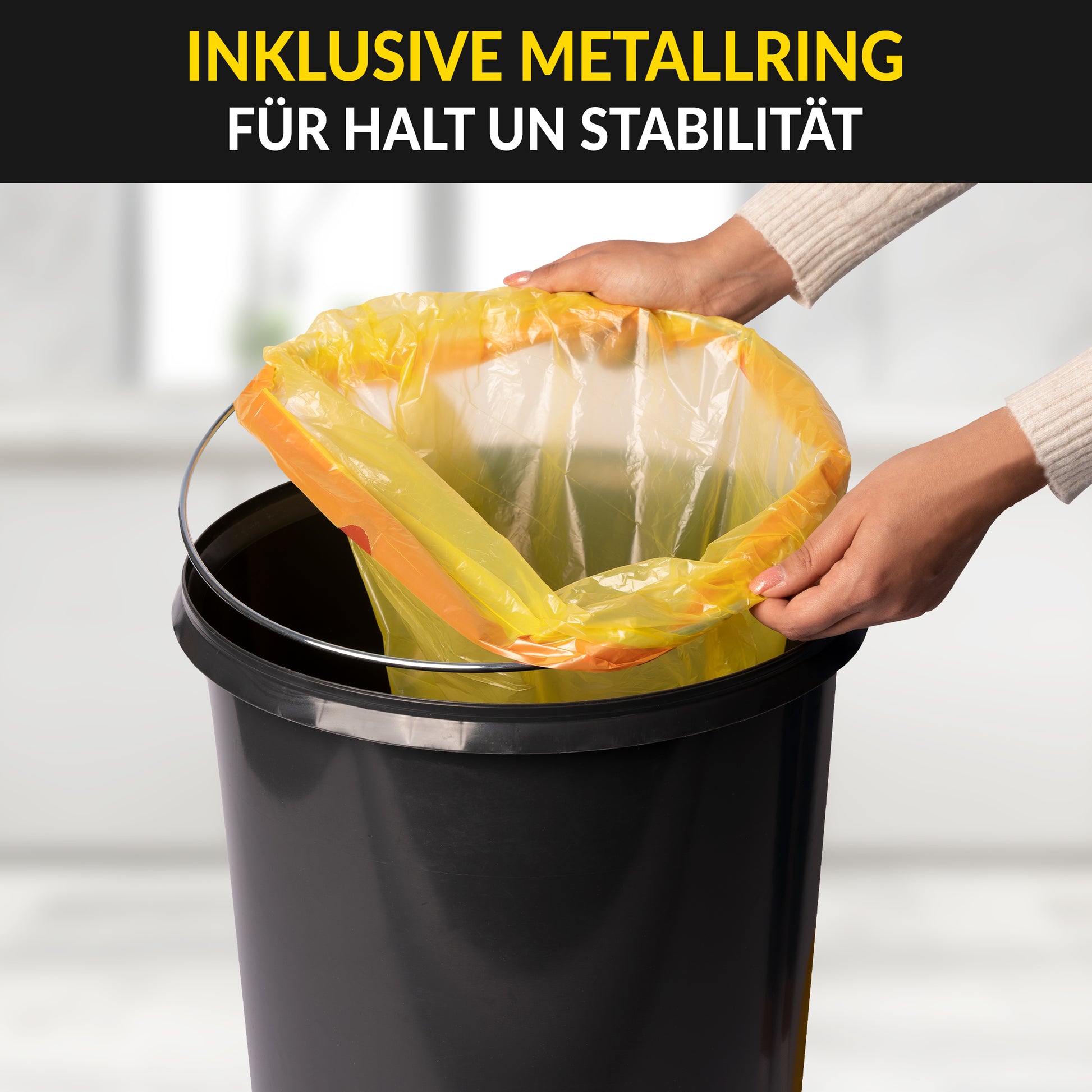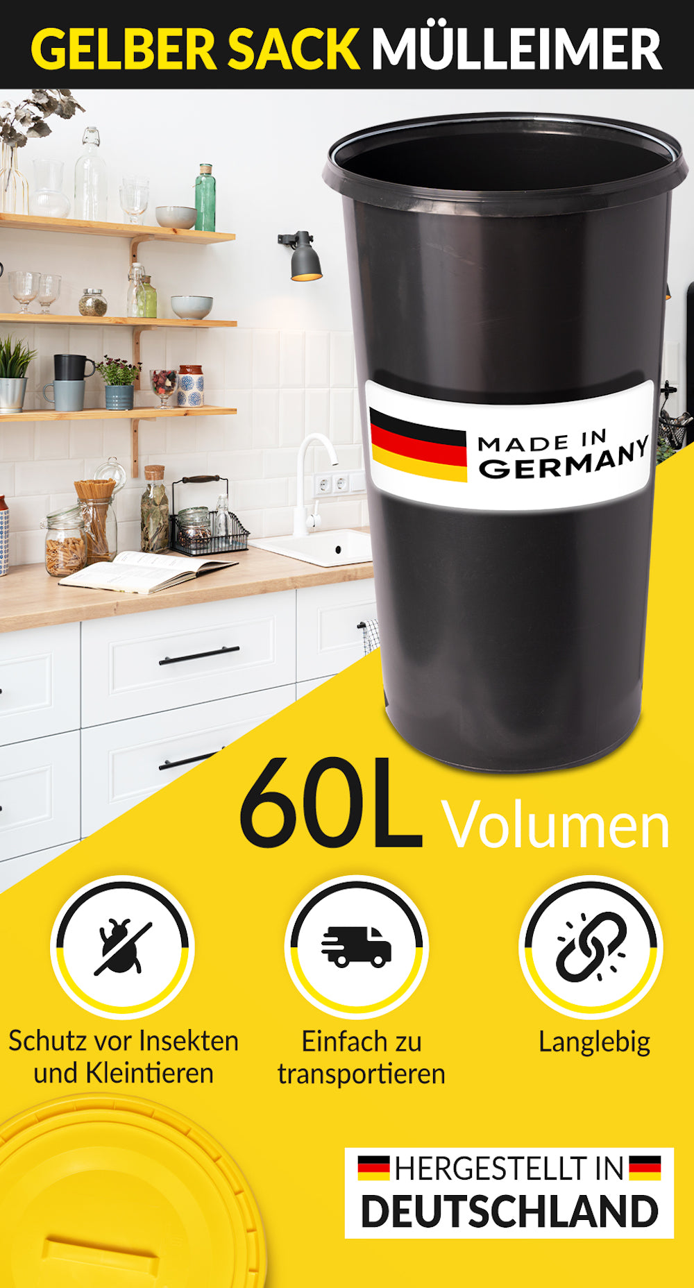 Der Gelbe Sack Eimer ist stabil, formschön und verschließbar. Es fasst ein Volumen von 60 Litern und ist aus hochwertigem Kunststoff hergestellt. Ausgestattet mit einem Metallring ist der Gelbe Sack Eimer ideal für die Abfallaufbewahrung bis zur Abholung durch die Müllabfuhr geeignet ist.