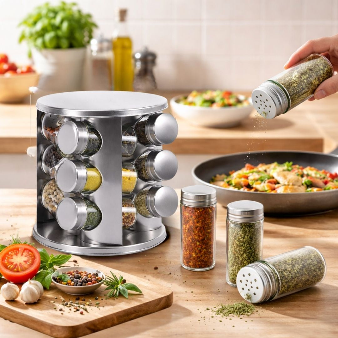 Ausgestattet ist der Gewürzständer mit 12 Glasbehältern mit Streufunktion, die Sie mit verschiedenen Gewürzen befüllen können. Ein Highlight ist der drehbare Standfuß, mit dem Sie jedes Gewürz schnell zur Hand und auch genauso schnell wieder verstaut haben.