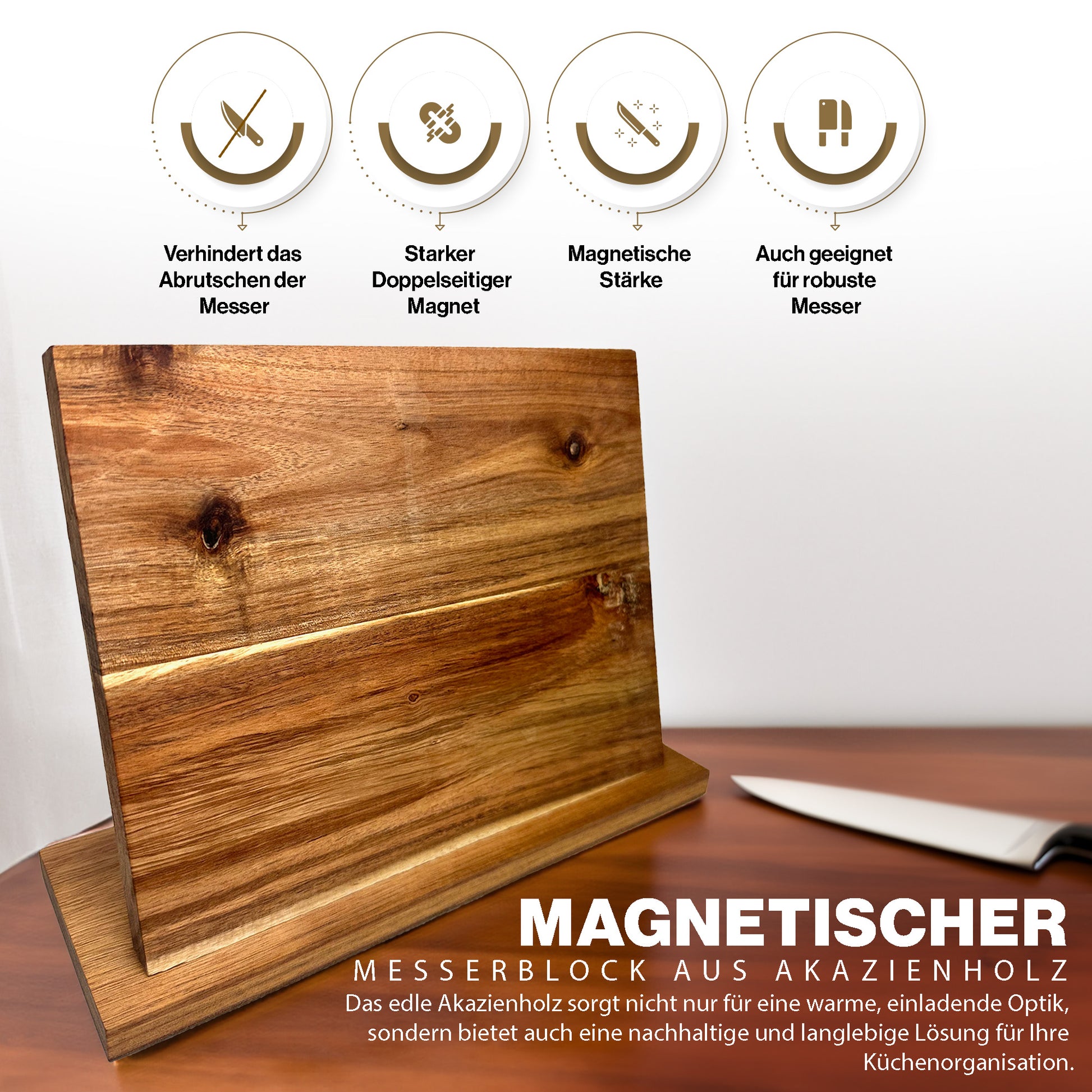 Das Tafelmesser-Set mit Wellenschliff ist ideal für Frühstück, Pizza oder Fleischgerichte – langlebig, robust und mit rutschfestem Kunststoffgriff. Der massive magnetische Messerblock aus Akazienholz überzeugt mit stilvoller Optik und platzsparender Funktion: Messer mit magnetischer Klinge haften beidseitig und sind jederzeit griffbereit. Ein echter Blickfang für jede Küchenzeile.