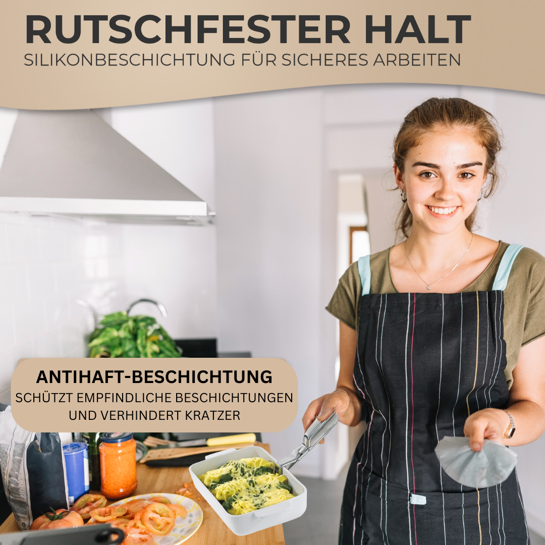 Mit den rutschfesten Silikongreifern sorgt die Zange dafür, dass empfindliche Oberflächen vor Kratzern geschützt werden. So bleiben Antihaft-Backformen und -bleche länger in einem guten Zustand. Außerdem ist diese praktische Küchenzange leicht zu reinigen, da es spülmaschinengeeignet ist und perfekt für den täglichen Gebrauch.