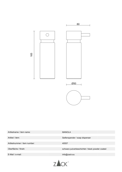 ZACK MANOLA Flüssigseifen Spender 175 ml Schwarz Nachfüllbarer Lotion Dispenser